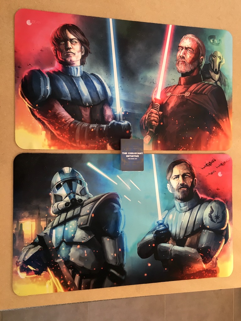 - Beautiful playmats (see picture below), 2 different ones forming a diptych (original illustration courtesy of Charles Logan and produced by Deep-Cut Studio)